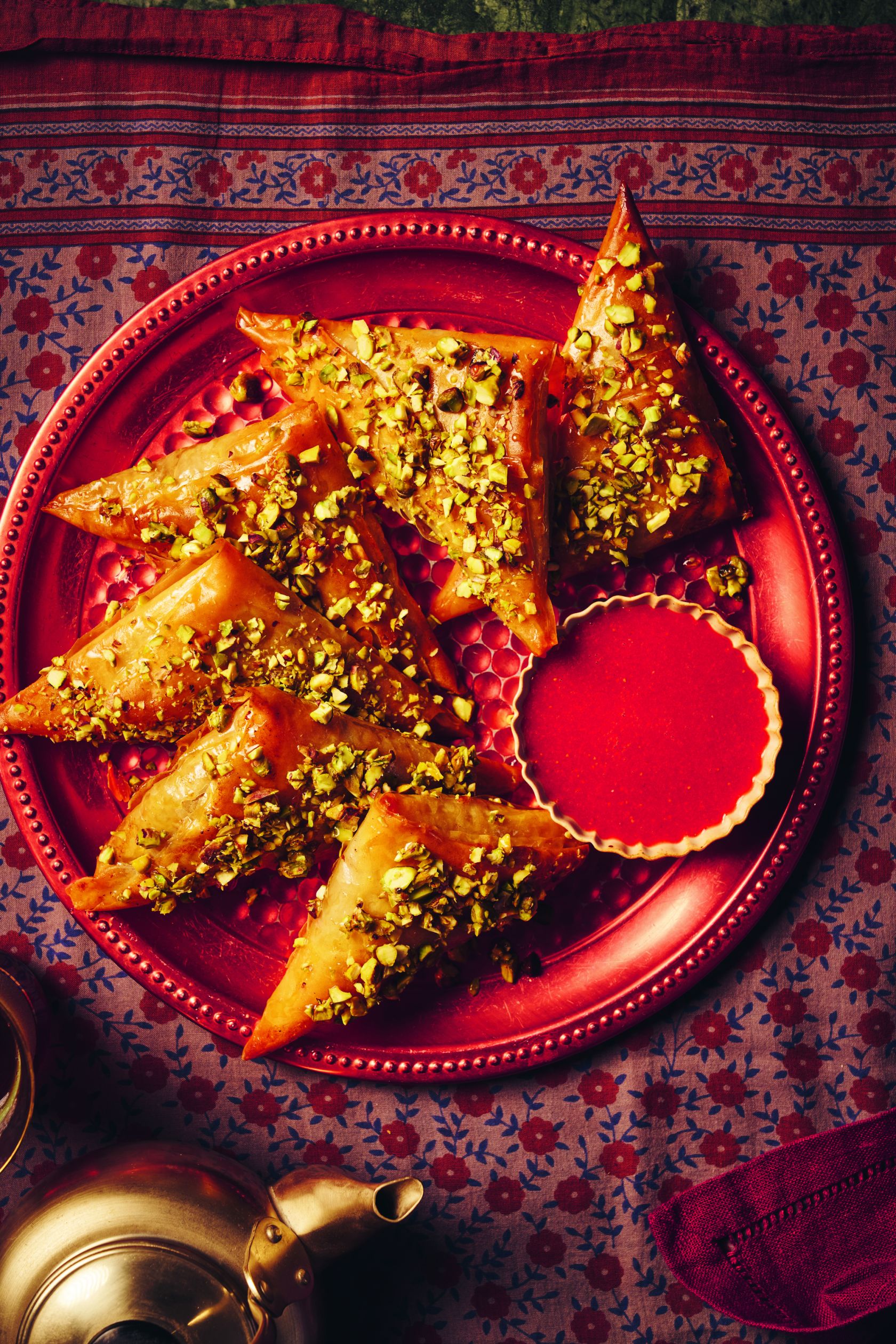 Take the triangles out of the oven and dip straight into the syrup till completely coated, then coat with pistachios and set aside.