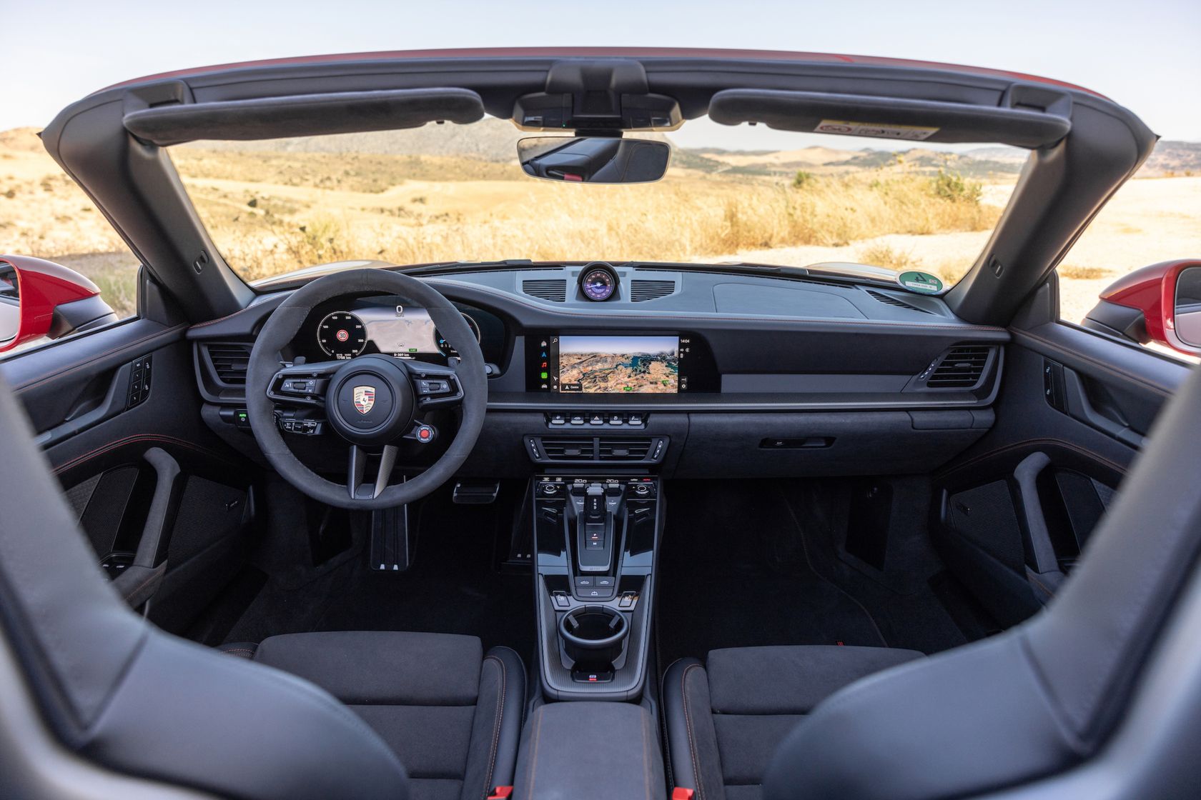 En el interior, el tema es similar al anterior, aunque con algo más de tecnología de la que hablar. La agradable mezcla de diales analógicos y digitales del antiguo 911 se ha abandonado, sustituyéndose por una pantalla de tamaño completo que encontrarás en coches como el Taycan. Porsche dice que así es más fácil ver la información clave y, aunque así sea, parece una pena que el 911 haya perdido una de sus últimas piezas de equipamiento de la vieja escuela en favor de otra pantalla más.