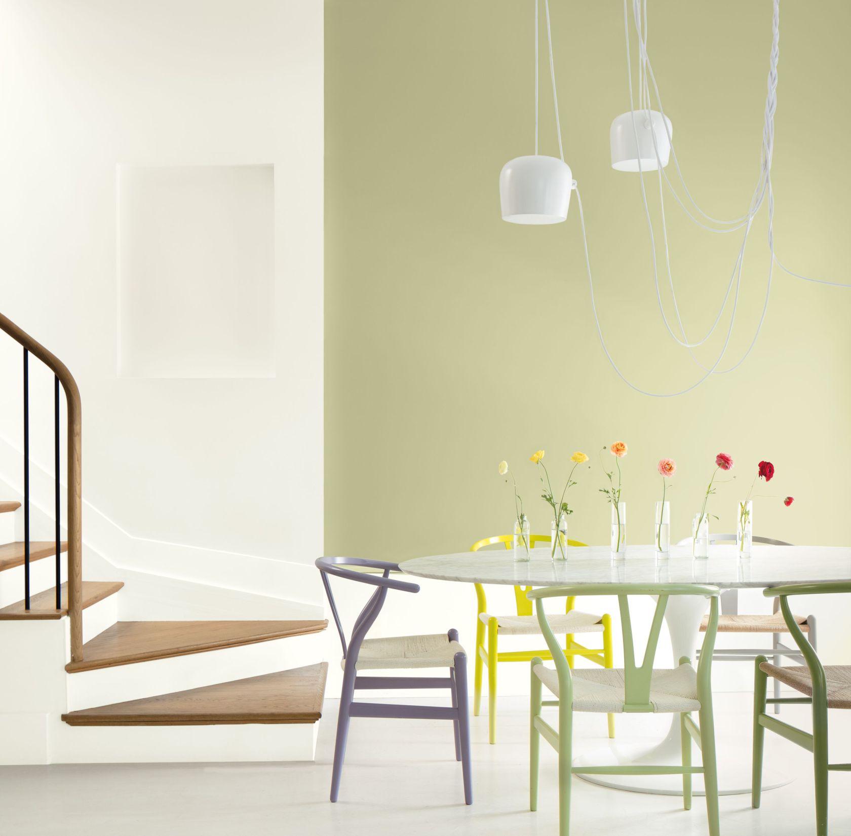 Perfettamente posizionata per catturare l'atmosfera, una parete dipinta con questa rinfrescante tonalità agrumata può essere abbinata alla classica vernice bianca sui mobili in legno, raccomanda Helen Shaw, direttore marketing (internazionale) di Benjamin Moore & Co. "E con mobili bianchi o pastello per un look fresco e facile da vivere".