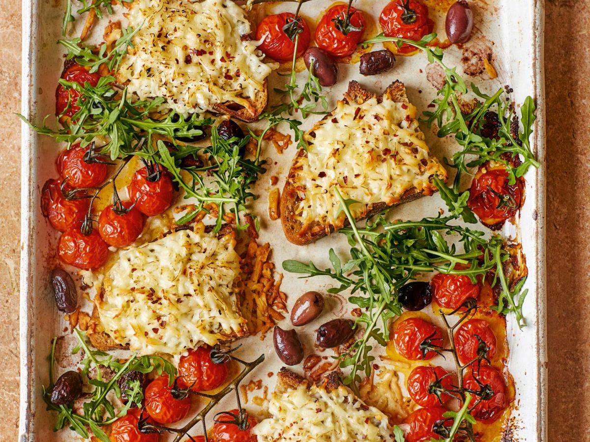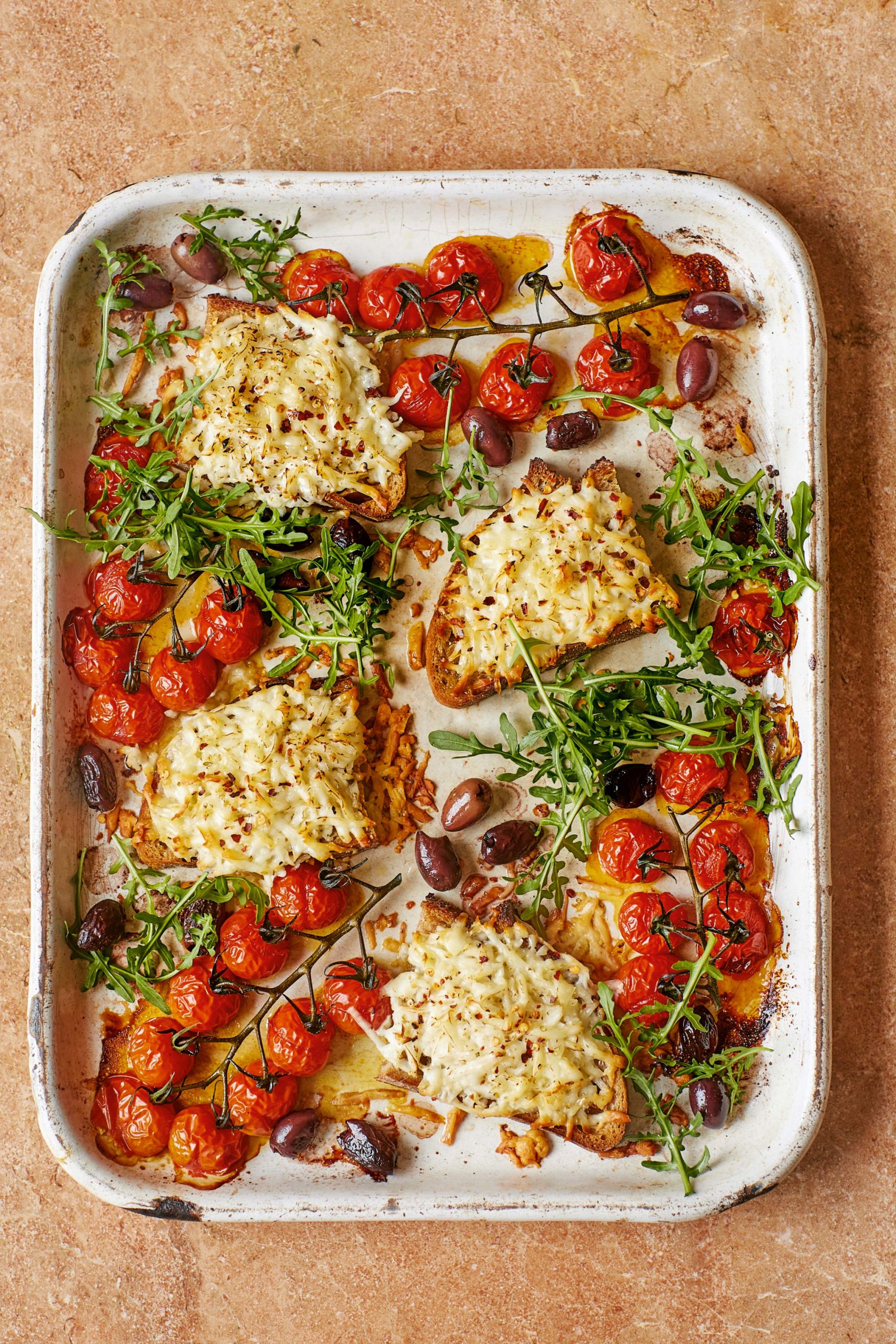 3. Distribuire l'halloumi grattugiato sui crostini, cospargere con l'origano o il timo, irrorare con l'olio d'oliva rimanente e infornare per altri 10-12 minuti fino a quando l'halloumi sarà fuso e dorato.