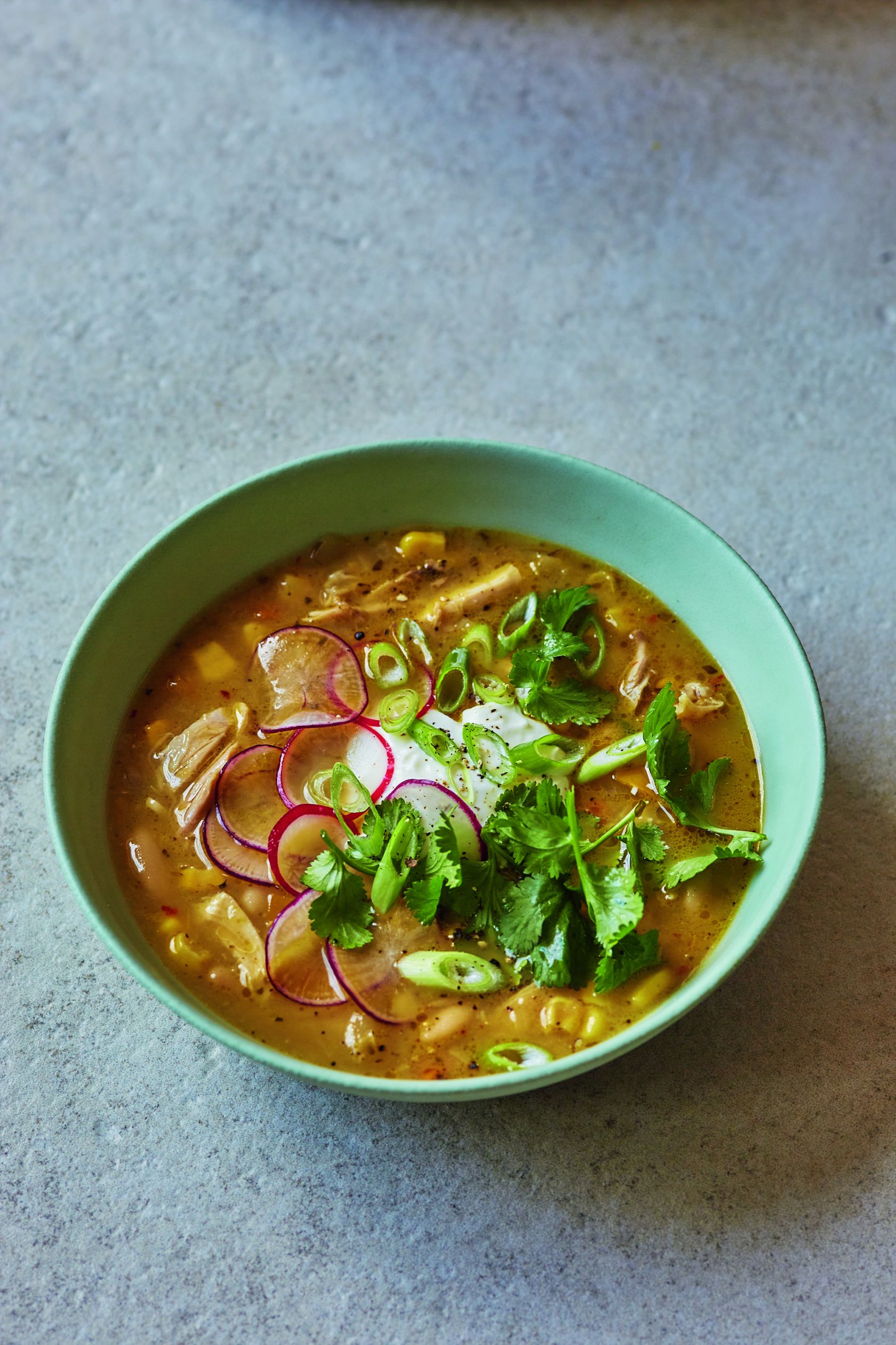 5. Aggiungete il mais surgelato e fate cuocere per circa cinque minuti, finché non diventa tenero. Togliete dal fuoco, aggiungete il pollo, il succo di lime, più un po' di scorza se vi piace, e assaggiate per verificare il condimento.