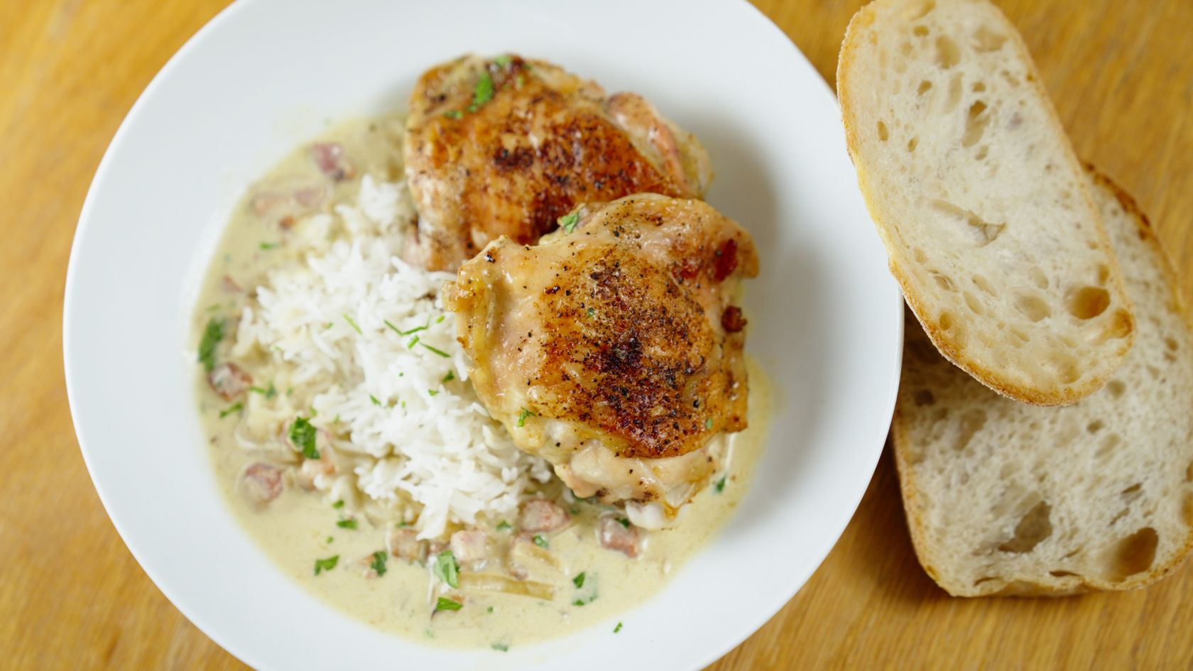 5. Quando le cosce sono cotte, toglierle dalla padella, scuotendo eventuali anelli di cipolla caramellata o lardelli. Mettete il pollo nel piatto da portata a riposare. Non si raffredderà e beneficerà enormemente dei circa 15 minuti di riposo necessari per preparare la salsa.