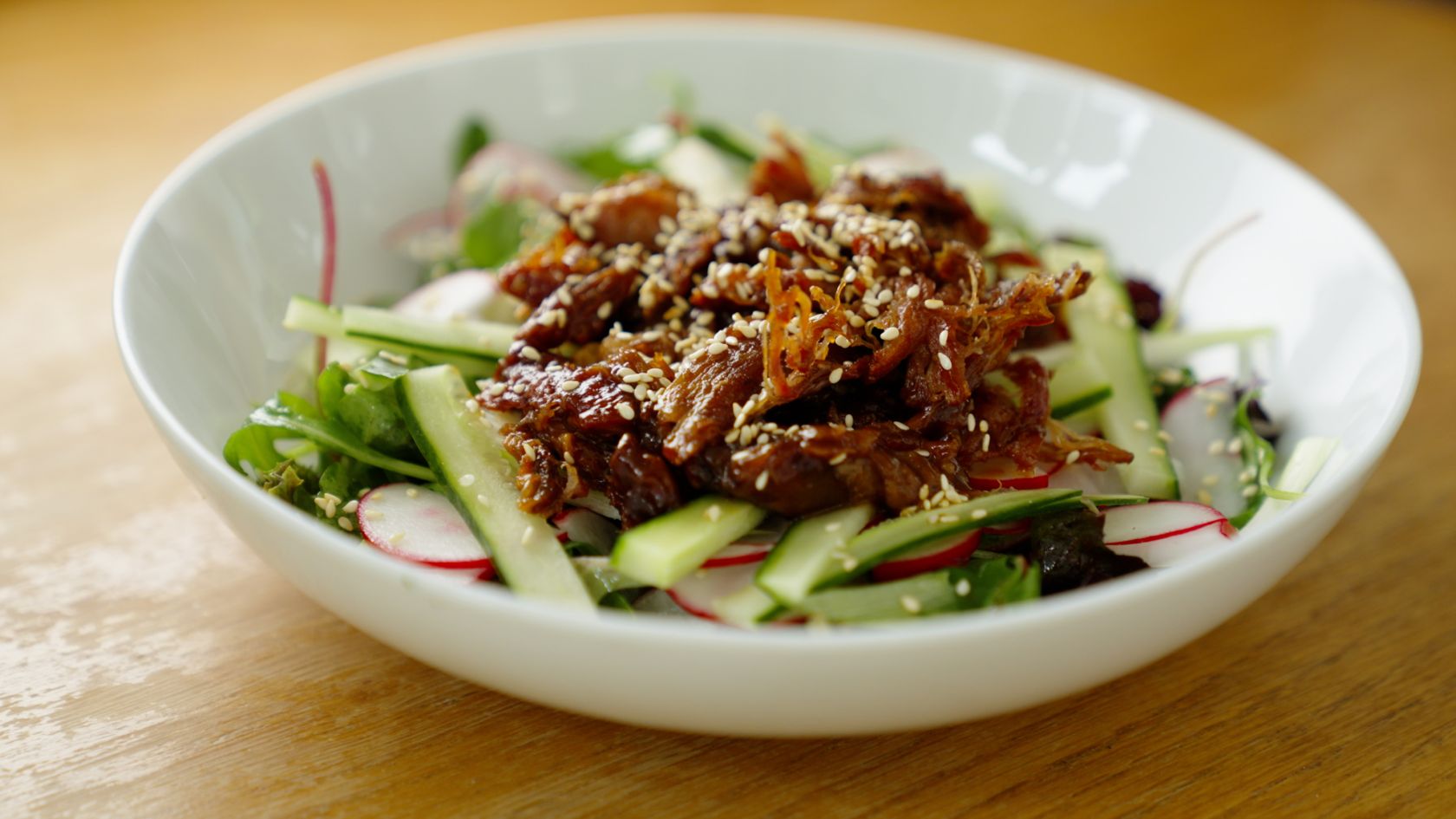 6. Mettere la salsa Hoi Sin sul fondo di una ciotola. Aggiungete l'anatra e mescolate per ricoprire completamente ogni pezzo. Ricoprire ogni porzione di insalata con un quarto dell'anatra. Cospargere con i semi di sesamo tostati e decorare con i cipollotti.