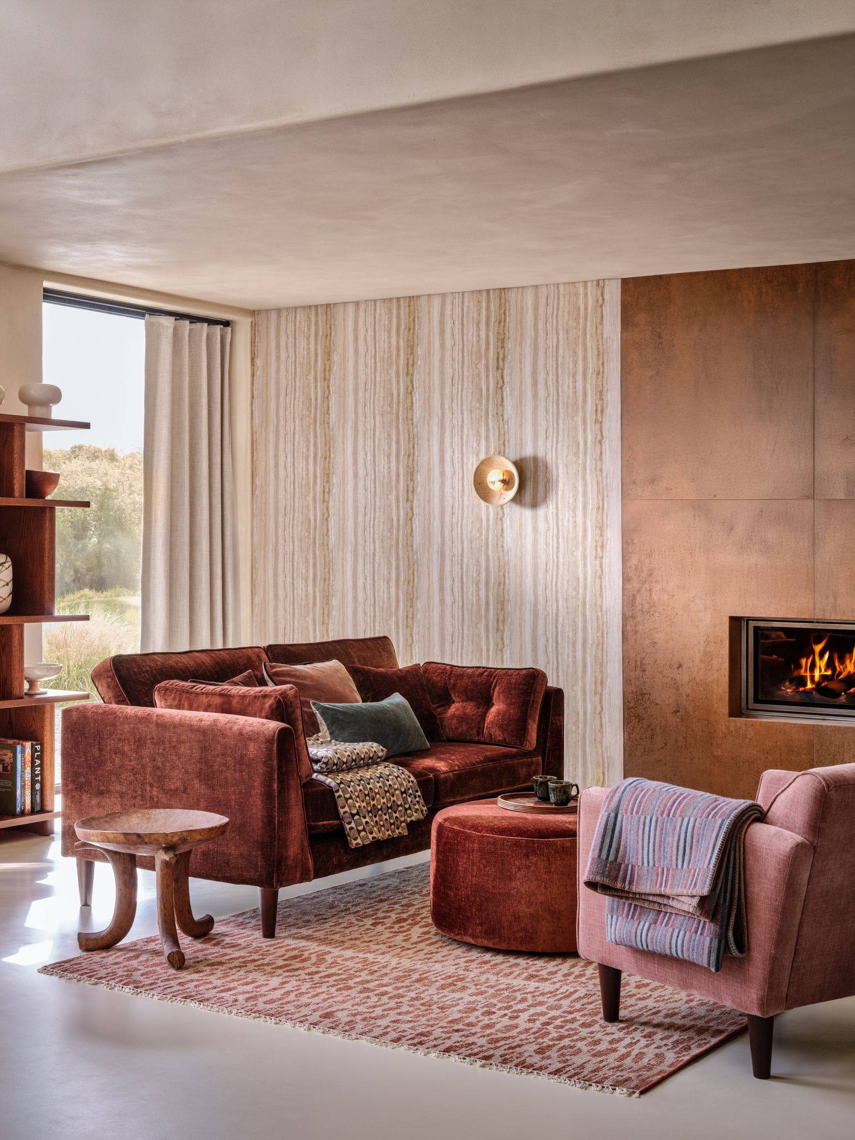 Ze zegt dat hoogpolige vloerbedekkingen en rijk fluwelen meubilair in warme terracotta's en roze tinten een onmiddellijk cocooning en geaard gevoel toevoegen, dat vaak ontbreekt tijdens de koudere maanden.
