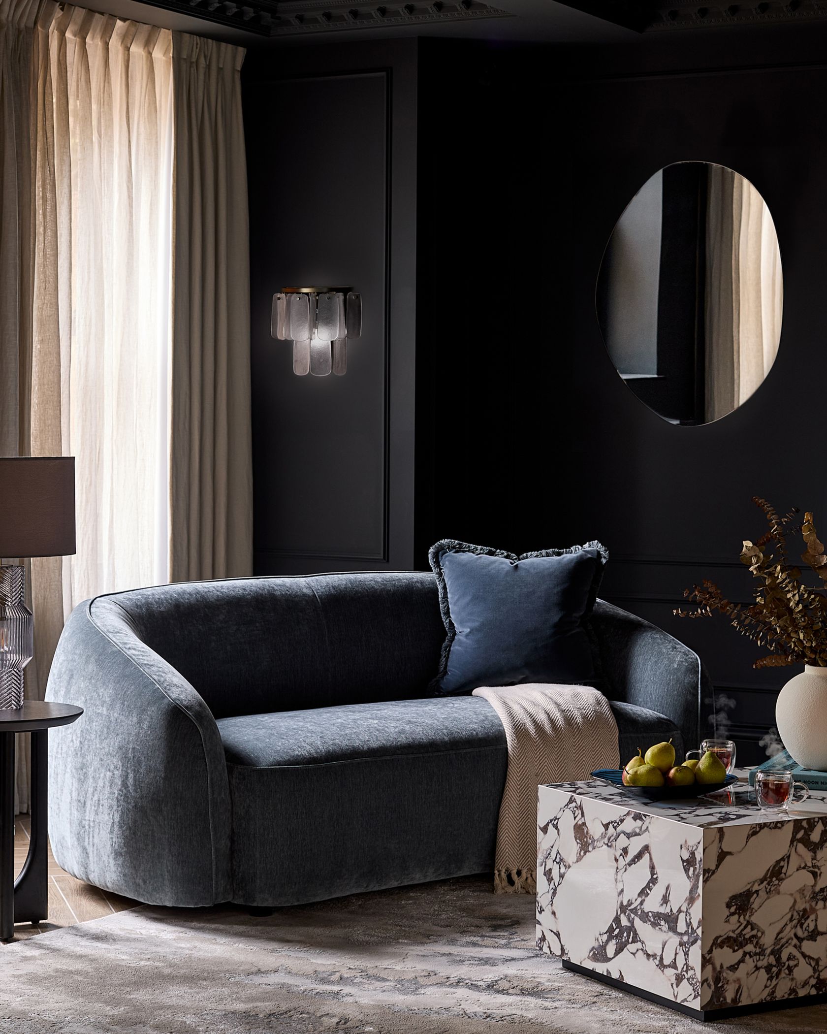 "Laat je inspireren door en omarm de moed van stormachtige blauwe tinten, verzacht met wolkachtige vormen en subtiele rondingen van je meubels."